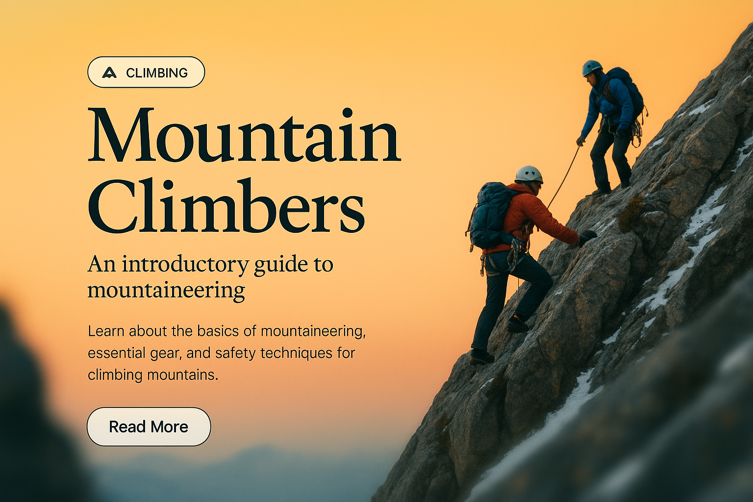 /Collection: /by davooda/Type: PNG/A visually striking landing page featuring mountain climbers in action against a gradient sunset background. It includes informative text about mountaineering basics and safety.