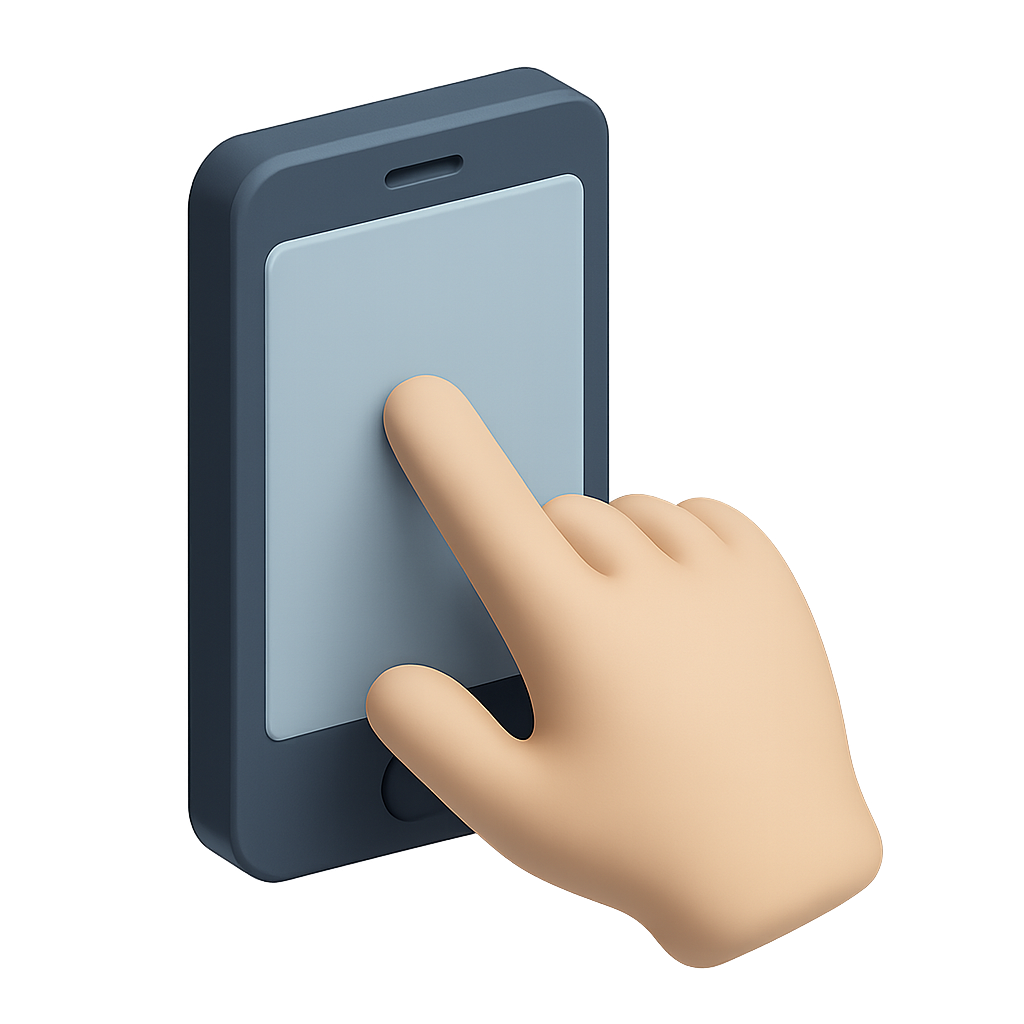 A 3D icon featuring a hand reaching out to touch a smartphone screen, presented in a three-quarter view with a transparent background. The design emphasizes a volumetric and isometric style.
