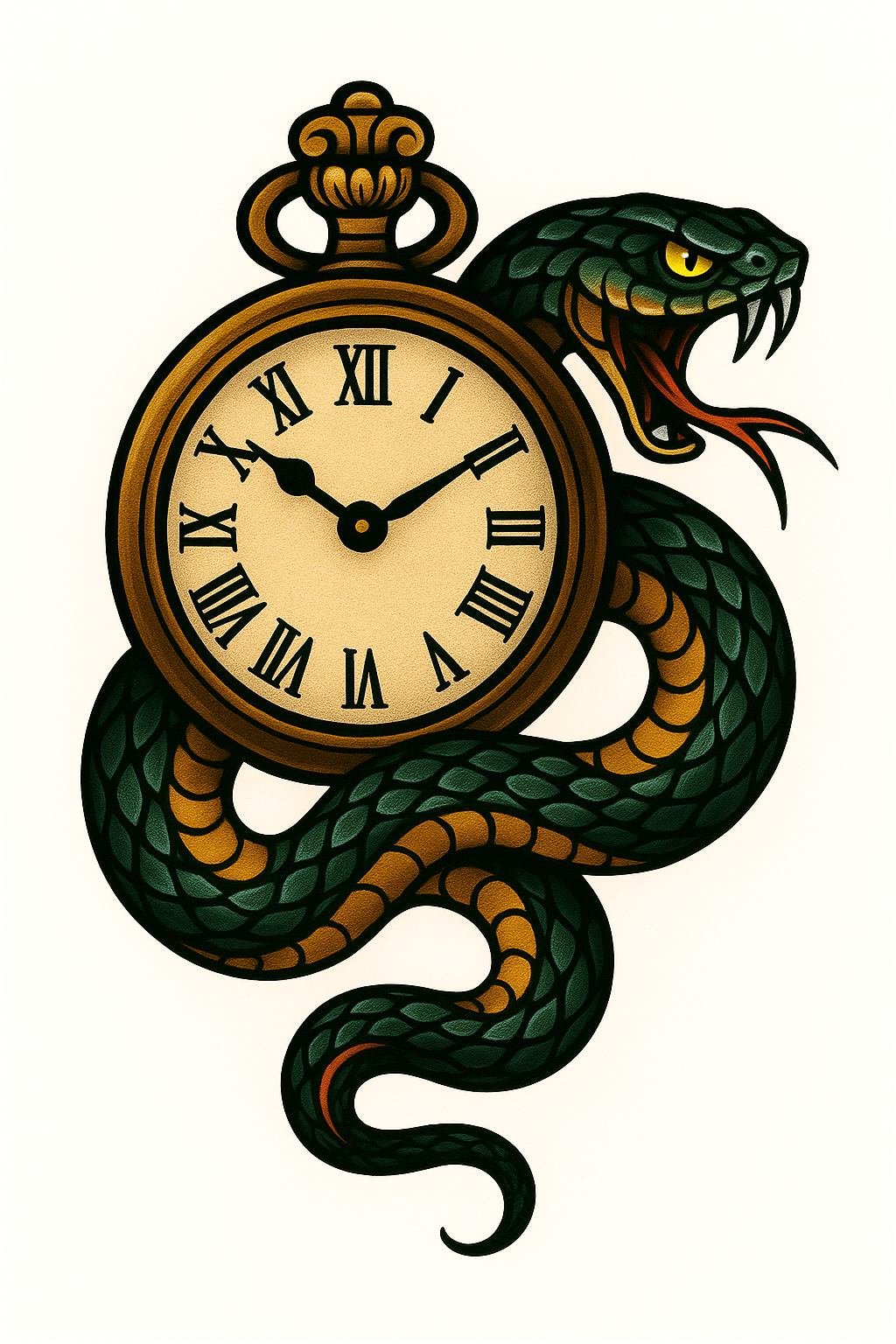This image features a vintage pocket watch entwined by a snake, showcasing a bold and colorful tattoo art style. Ideal for tattoo enthusiasts and art lovers.