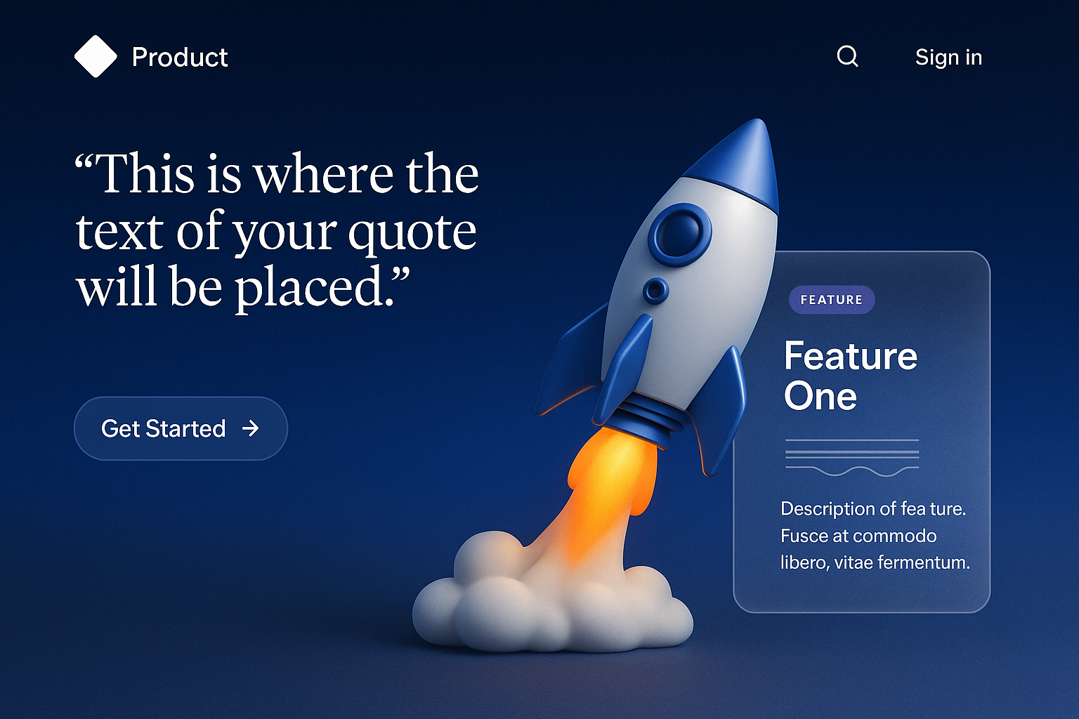 A visually striking 3D landing page featuring a rocket launching from clouds. Includes a quote section, action button, and feature descriptions, all set against a dark gradient background for a modern look.