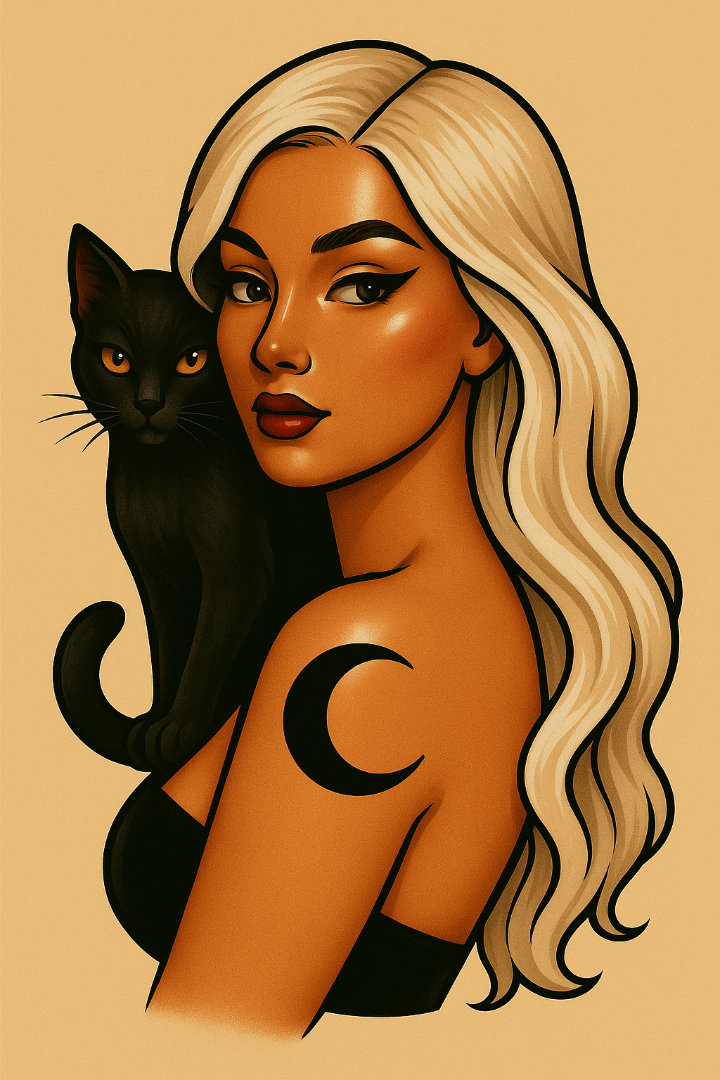 /Collection: /by davooda/Type: PNG/A striking illustration of a woman with long, flowing blonde hair and a black cat perched on her shoulder. She features a prominent moon tattoo on her arm, set against a soft beige background, reminiscent of classic tattoo art with a glossy anime-style finish.