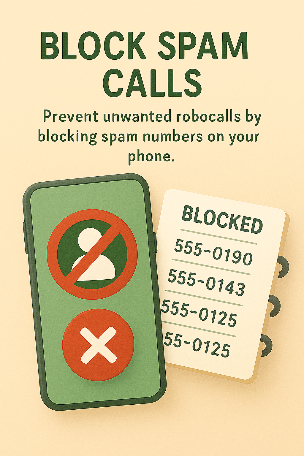 Illustrative graphic depicting a smartphone alongside a list of blocked spam numbers. Ideal for educational content on mobile phone safety and call management.