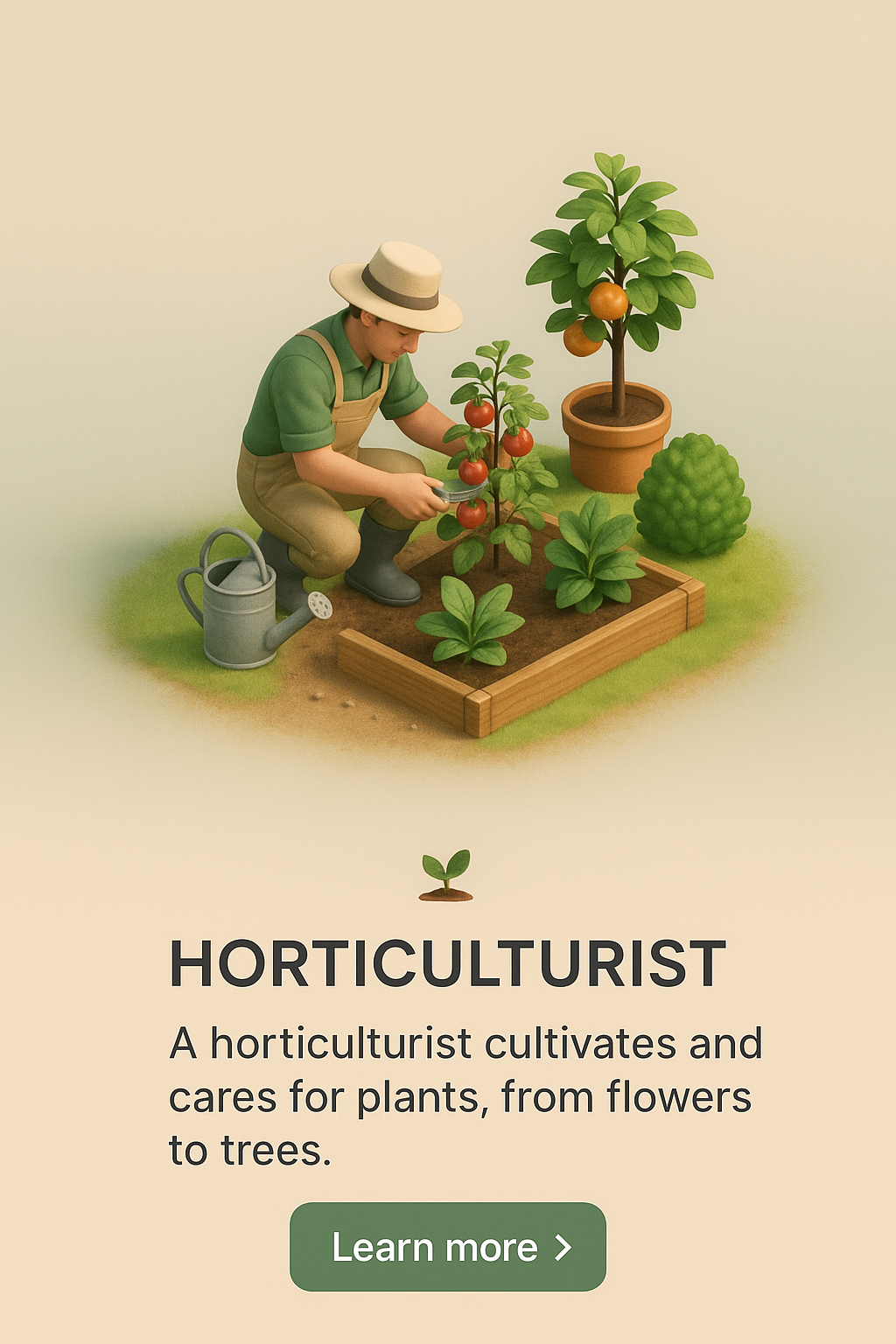 A detailed 3D illustration of a horticulturist tending to a garden, showcasing plants and a serene environment. The scene captures a zoomed-out perspective.