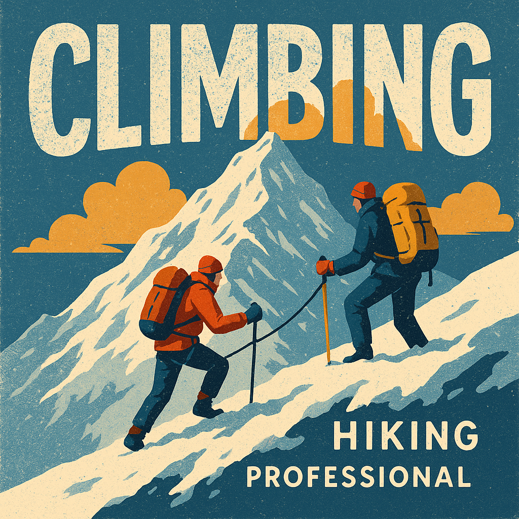 Vibrant retro-style illustration depicting two climbers scaling a snowy mountain, ideal for adventure sports promotion or outdoor activity marketing.