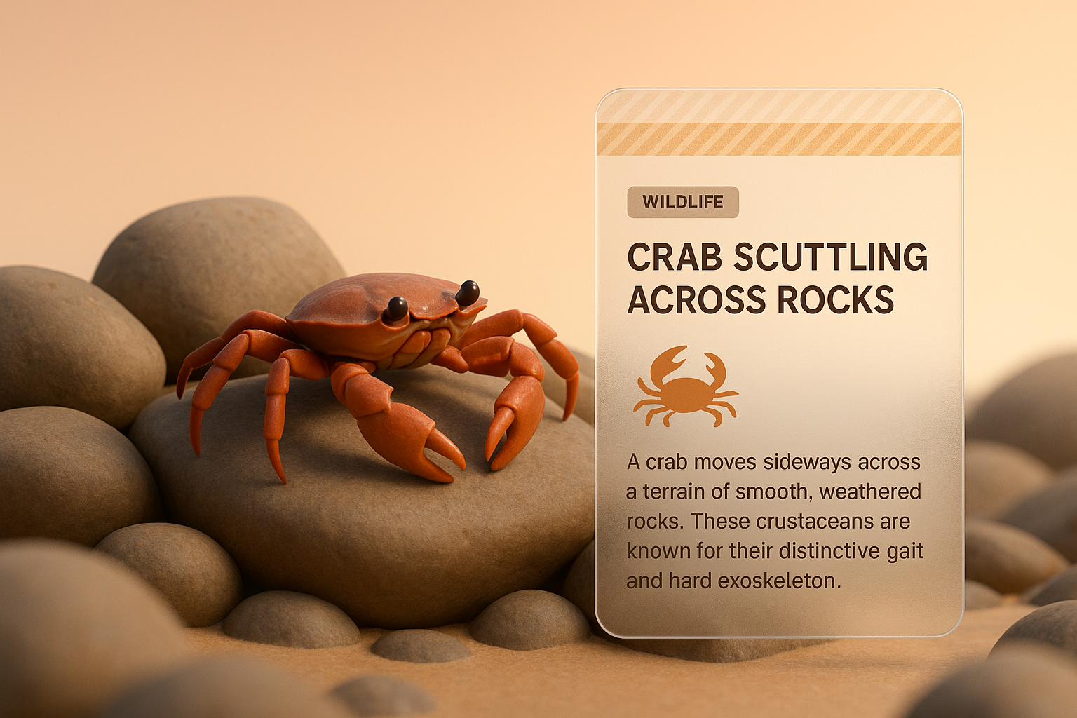 /Collection: /by davooda/Type: PNG/A detailed 3D illustration of a crab moving sideways across smooth, textured rocks. The design features a transparent information block with a title and additional graphics, enhancing the natural setting.