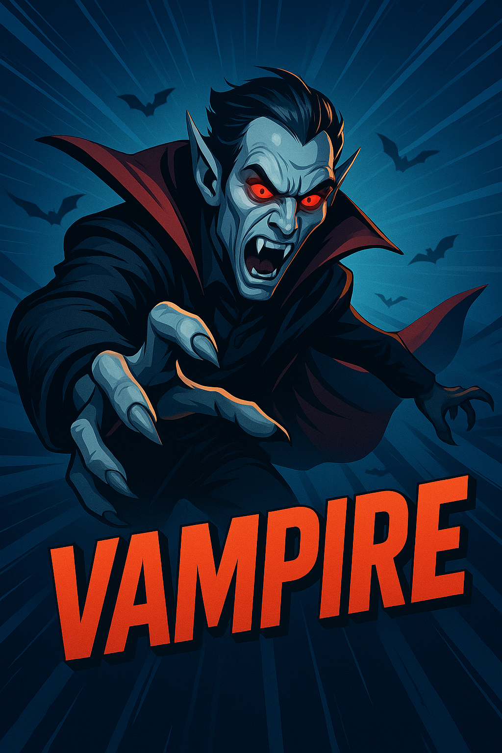 Dynamic Vampire Illustration with Bold Text and Dramatic Colors