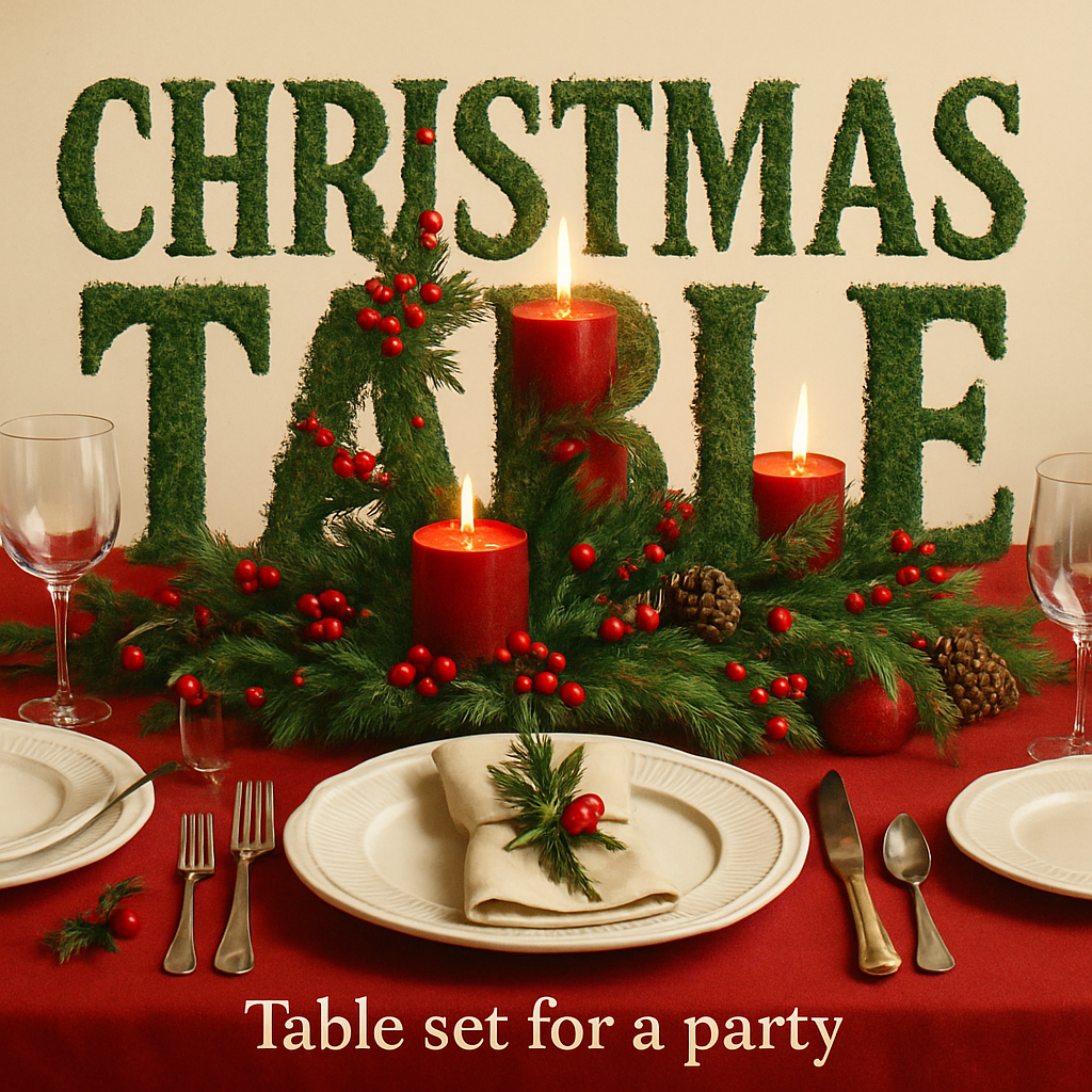 /Collection: /by davooda/Type: PNG/Charming holiday table setting featuring a festive arrangement with candles, greenery, and elegant tableware, perfect for seasonal gatherings and celebrations.