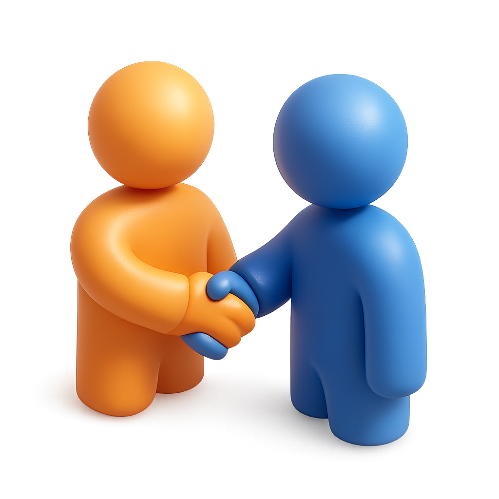 /Collection: /by davooda/Type: PNG/This image features two stylized 3D figures, one orange and one blue, engaged in a handshake. The figures are depicted in a three-quarter view with a smooth, volumetric texture, set against a gradient background.