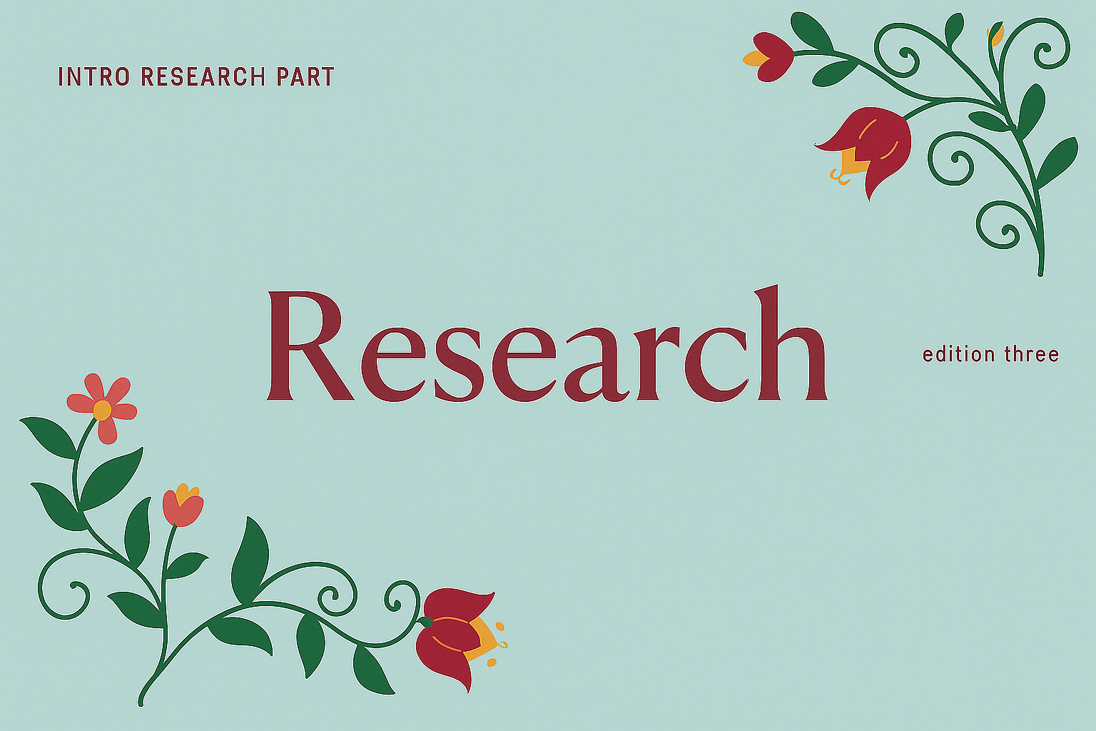 An artistic design featuring colorful floral patterns and bold text reading 'Research edition three'. The background is a soft blue, enhancing the vibrant colors.