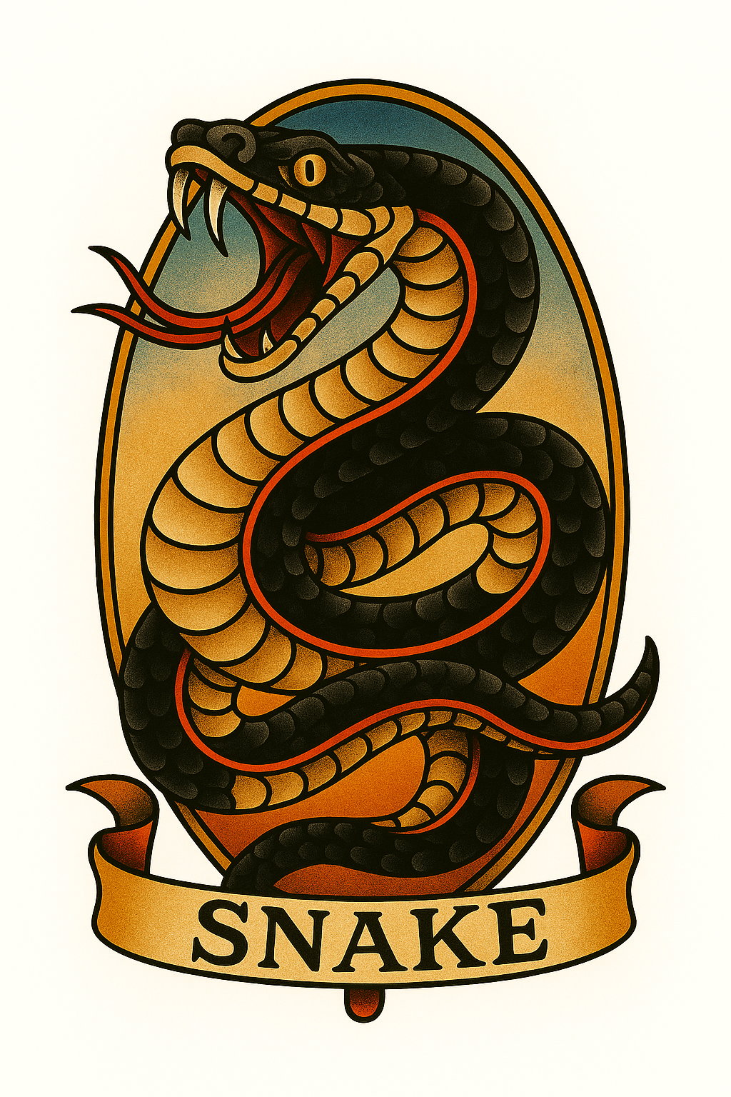 Illustrative tattoo design featuring a stylized snake, characterized by bold lines and a vintage aesthetic, ideal for tattoo enthusiasts and artists.