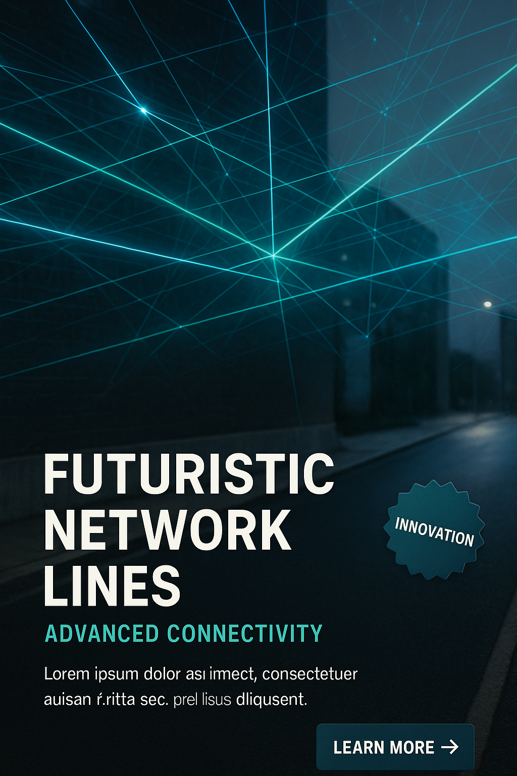 An innovative design featuring blue and green network lines against a dark urban background, highlighting advanced connectivity. Includes a bold title and a call-to-action button.