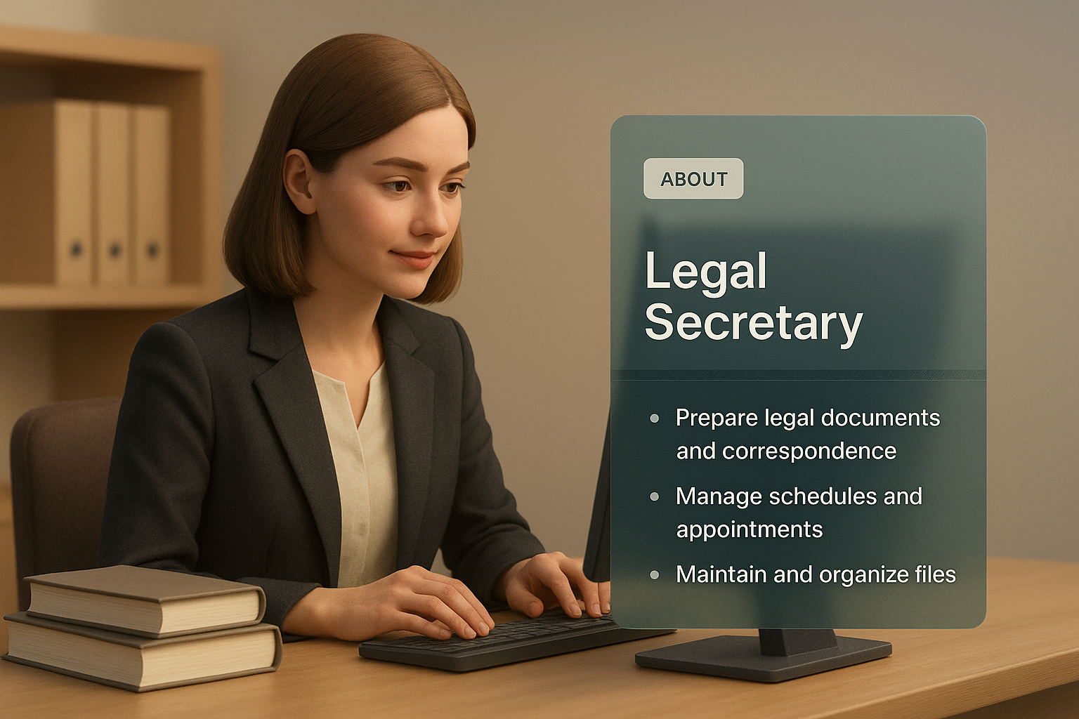 /Collection: /by davooda/Type: PNG/A 3D illustration featuring a professional legal secretary at a desk, with a translucent panel displaying key responsibilities in a modern design. The background is a smooth gradient, enhancing readability.
