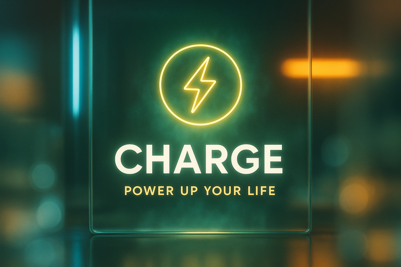 A captivating neon-themed design featuring the word 'CHARGE' illuminated by glowing accents. The background is layered with a translucent glass effect and a misty ambiance, creating depth.
