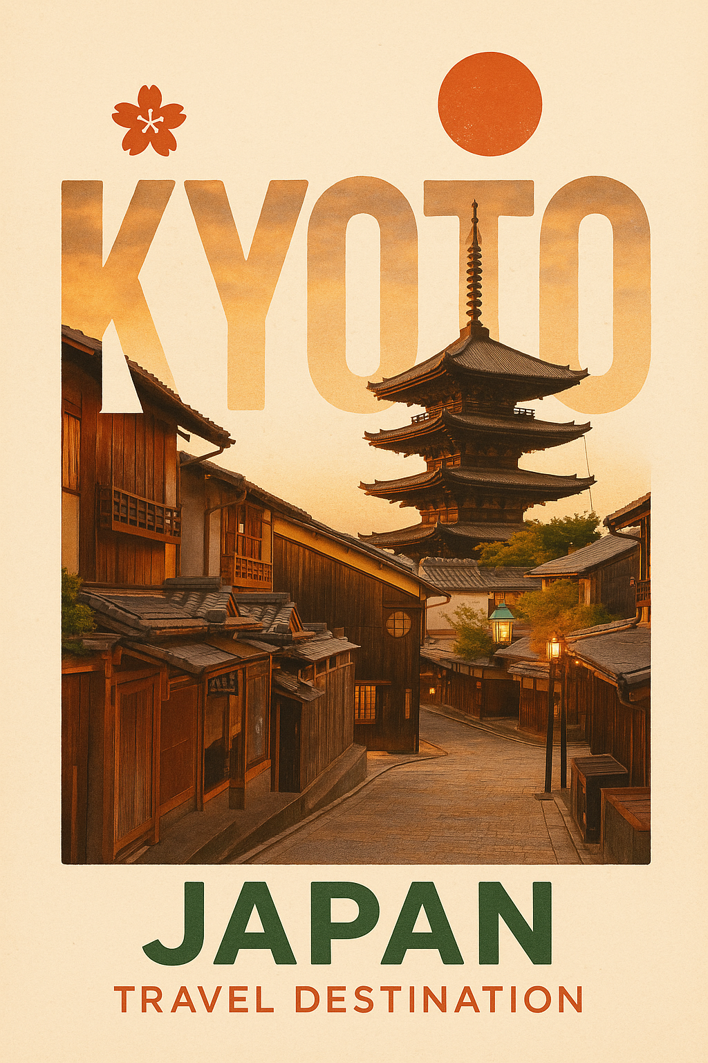 /Collection: /by davooda/Type: PNG/A visually appealing vintage-style travel poster showcasing the iconic architecture of Kyoto, Japan. This image captures the charm and culture of the city, making it ideal for travel enthusiasts and tourism marketing.