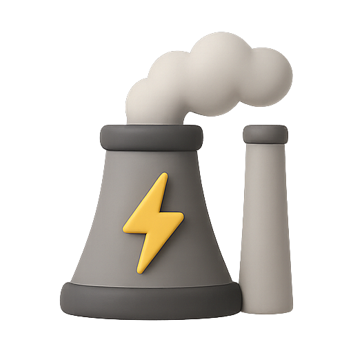 A stylized 3D illustration of a power plant featuring a smokestack emitting clouds. The design is modern and playful, making it suitable for educational or environmental themes.