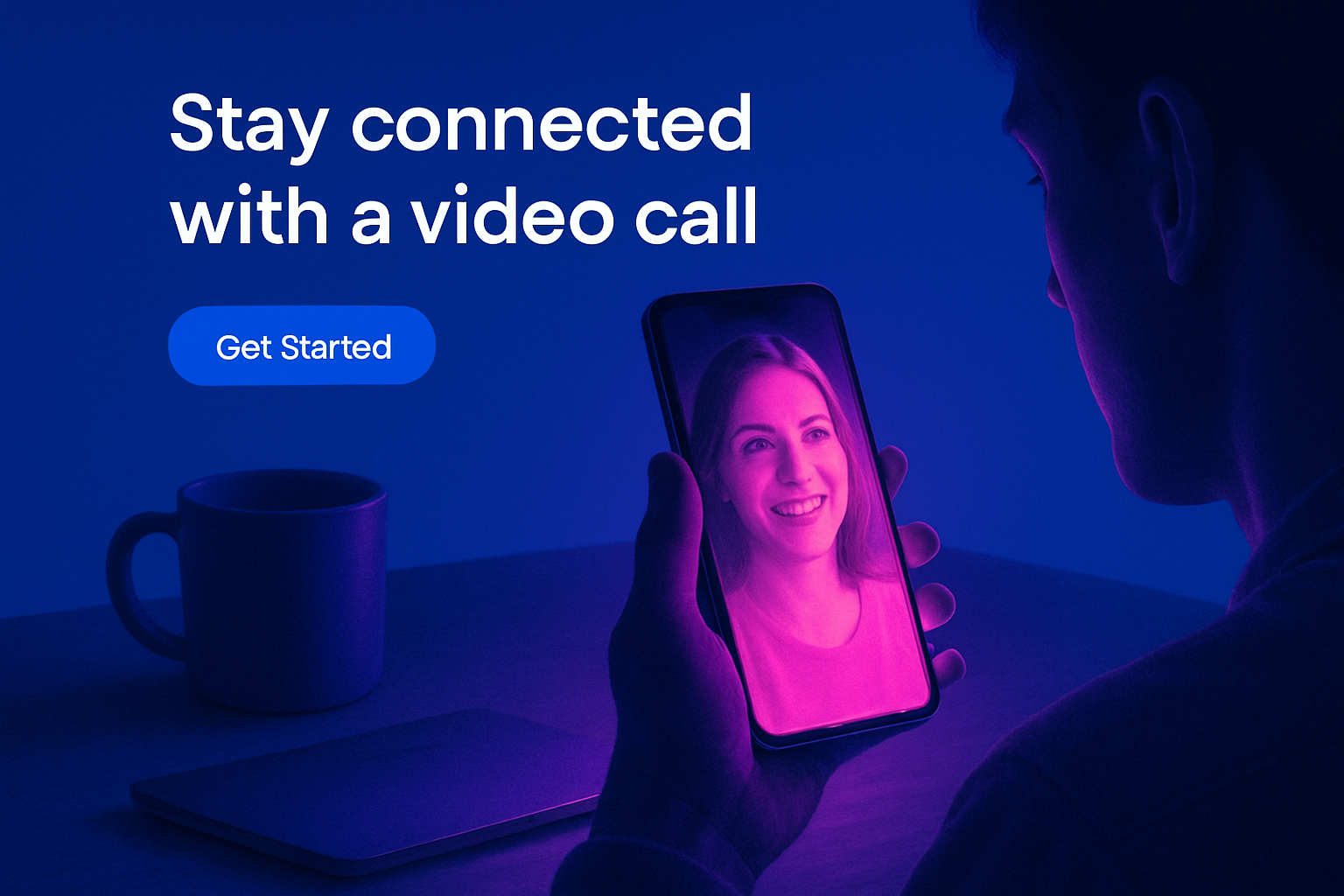 A person engaged in a video call holds a phone glowing with a neon pink hue, surrounded by a solid blue background. The scene is illuminated with cool shades of blue and violet, enhancing the atmosphere.