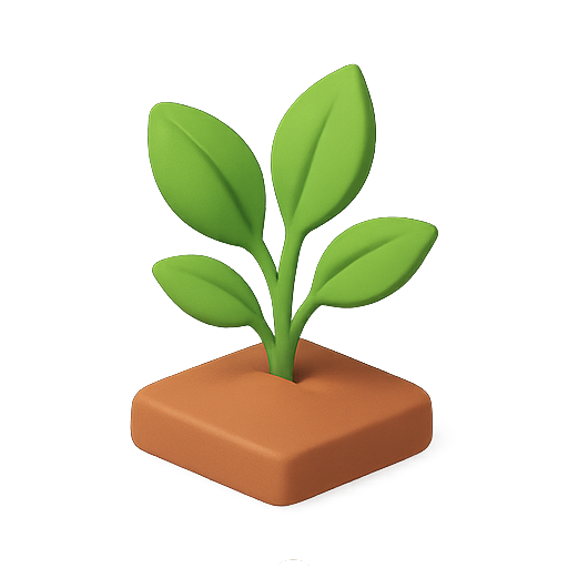 3D-rendered icon depicting a small plant with green leaves growing from a brown square base, ideal for eco-friendly themes or gardening applications.