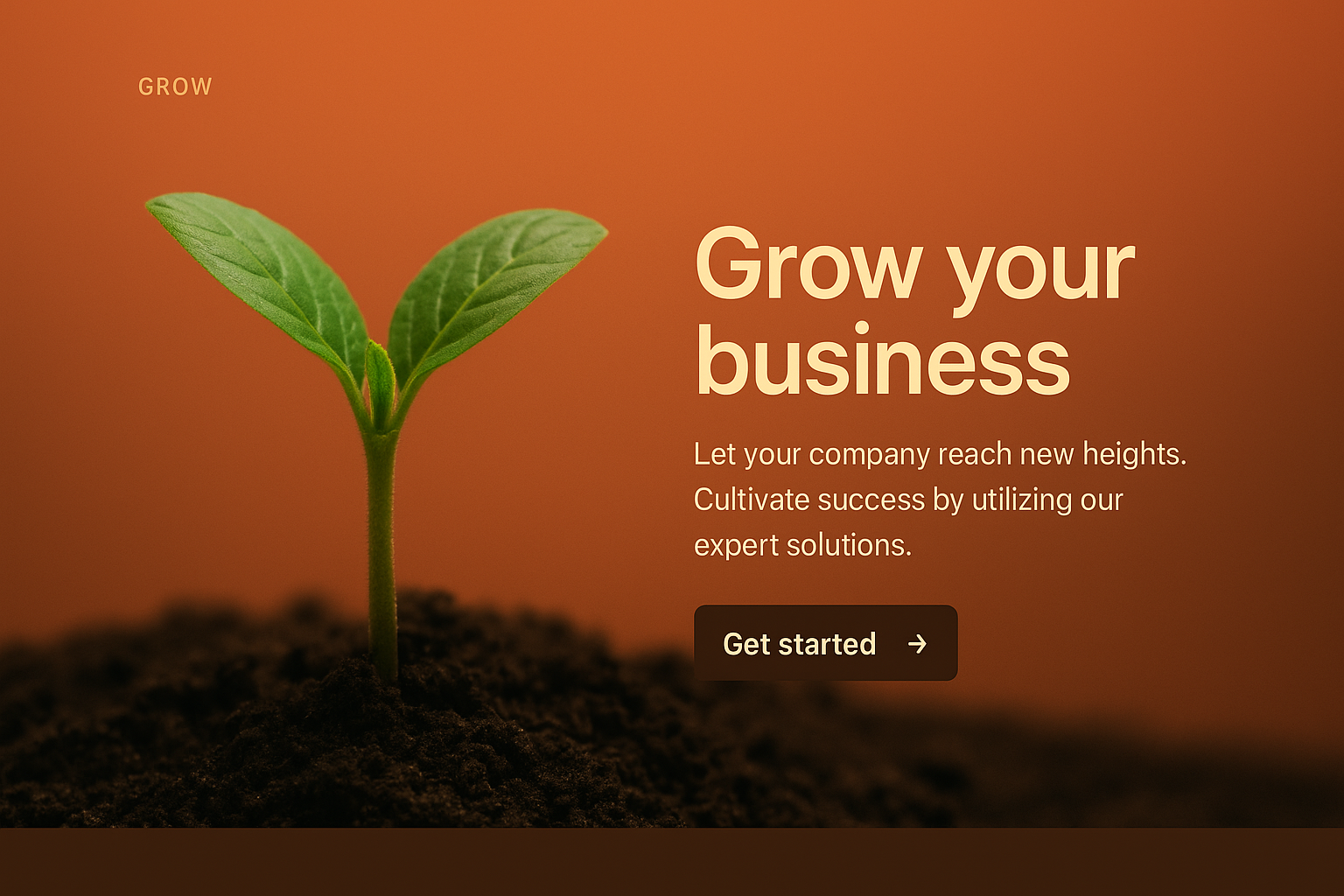A modern web design featuring a plant sprouting from soil, symbolizing growth. The layout includes a prominent call-to-action button, small labels, and clear text for readability.