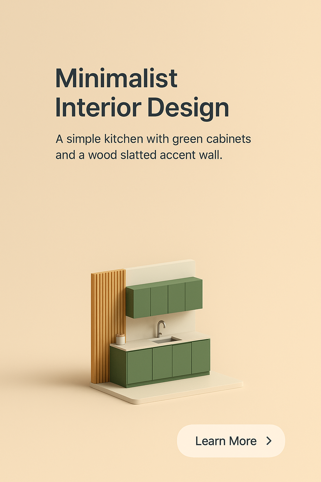 /Collection: /by davooda/Type: PNG/A visually appealing minimalist kitchen featuring green cabinets and a wood slat wall, set against a smooth gradient background. The design emphasizes simplicity and realism.