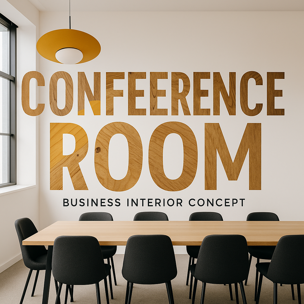 Stylish conference room interior featuring bold typography on the wall, showcasing a contemporary business environment ideal for meetings and presentations.