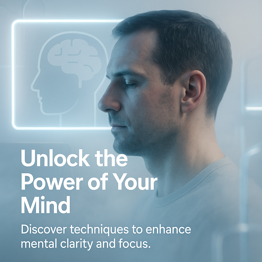 A visually engaging graphic promoting techniques for mental clarity and focus, featuring a calm individual with a brain illustration. Ideal for wellness or self-improvement marketing.