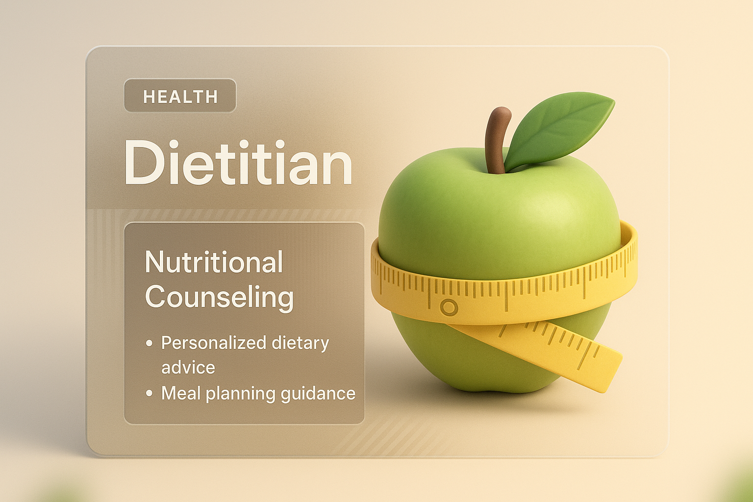 /Collection: /by davooda/Type: PNG/A visually appealing card featuring a 3D green apple wrapped in a yellow measuring tape, symbolizing dietary advice and meal planning. The background is a smooth gradient enhancing readability.