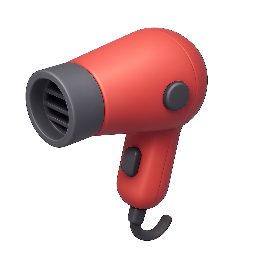 A sleek and modern 3D icon of a blow dryer, presented in a three-quarter view. It features a vibrant red color with gray accents, showcasing a volumetric design on a transparent background.