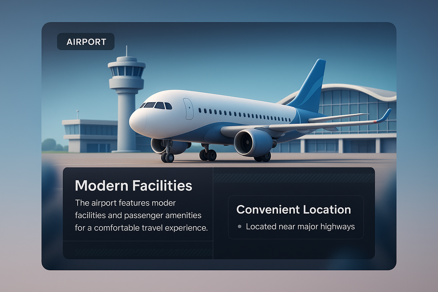 /Collection: /by davooda/Type: PNG/A visually engaging 3D illustration of an airport featuring a modern airplane and supporting text blocks. The design includes a gradient background and integrated informational panels.