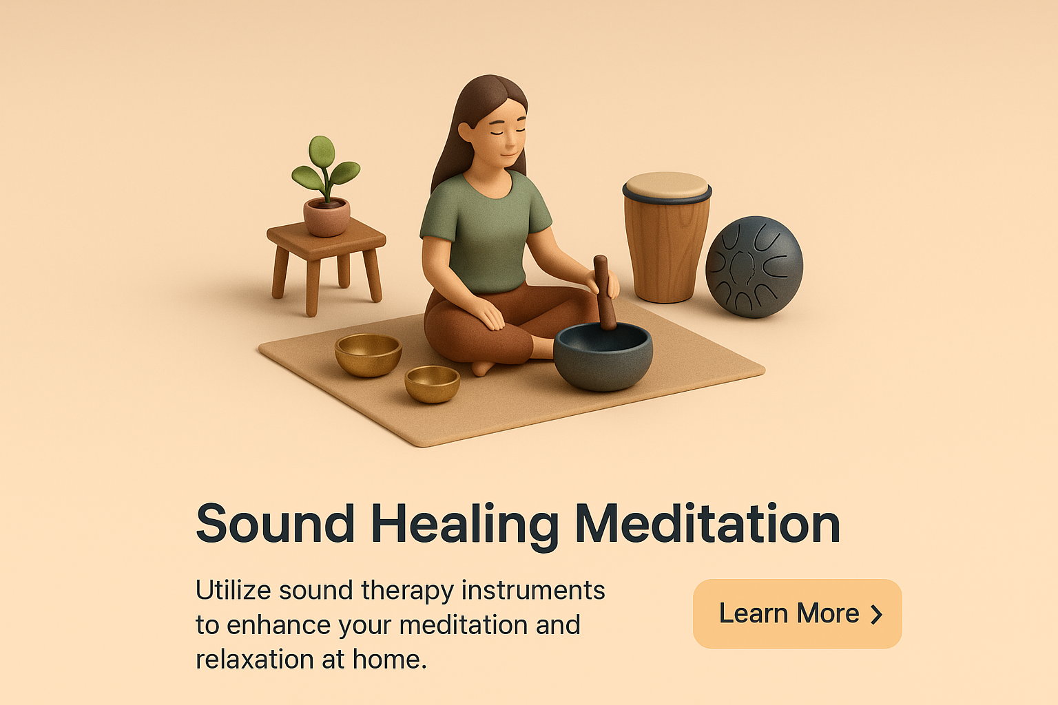 /Collection: /by davooda/Type: PNG/A serene scene depicting a person engaged in sound healing meditation, surrounded by therapy instruments. The warm gradient background enhances the calming atmosphere, inviting relaxation.