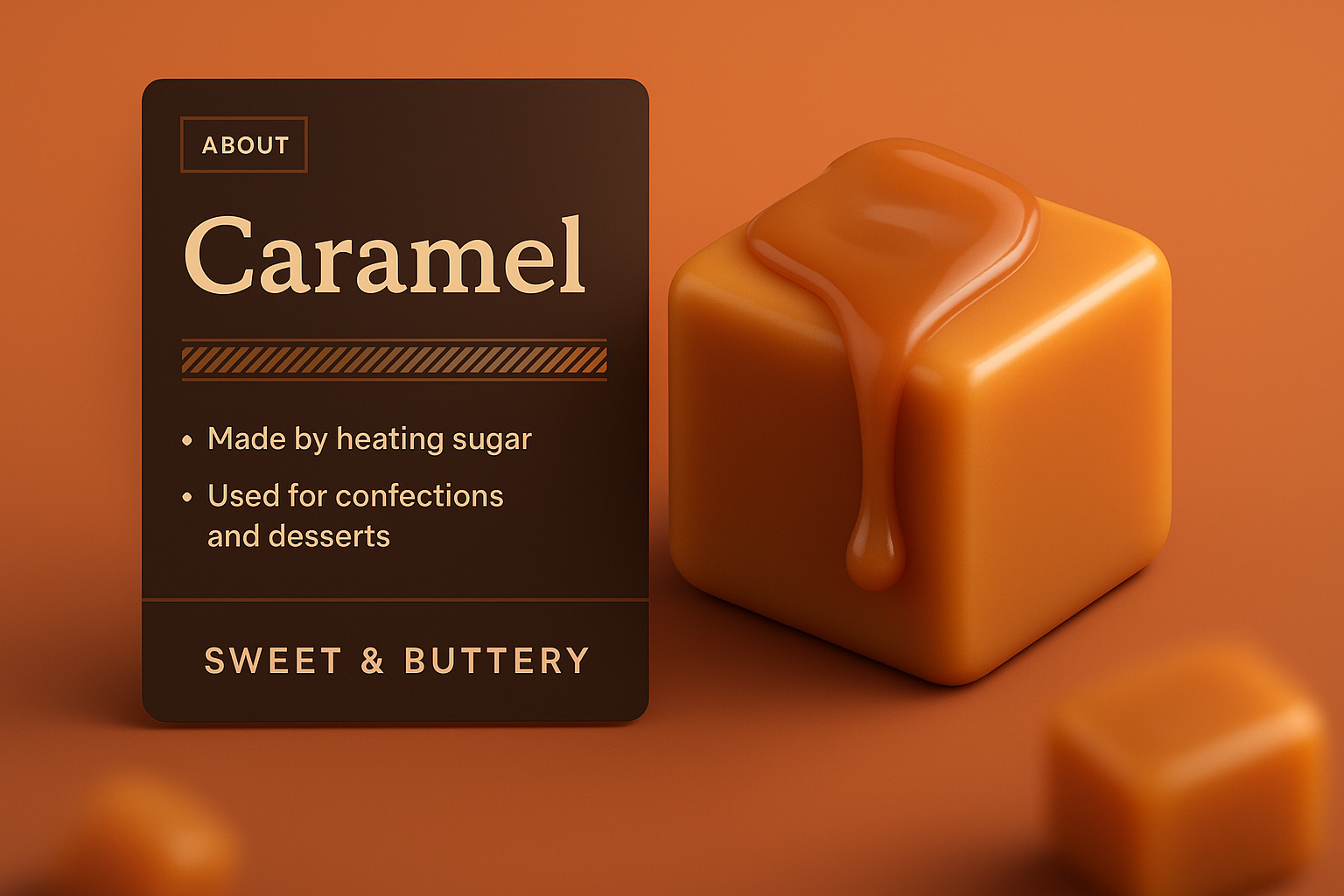 /Collection: /by davooda/Type: PNG/A 3D illustration featuring a glossy caramel cube with a drizzle, accompanied by a dark informational card detailing caramel's uses. The background is a smooth gradient in warm tones.