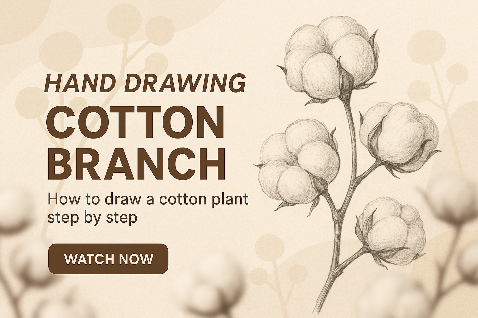 Informative graphic featuring a hand-drawn cotton branch, designed as a tutorial banner for an art lesson. Ideal for educational content on drawing techniques.