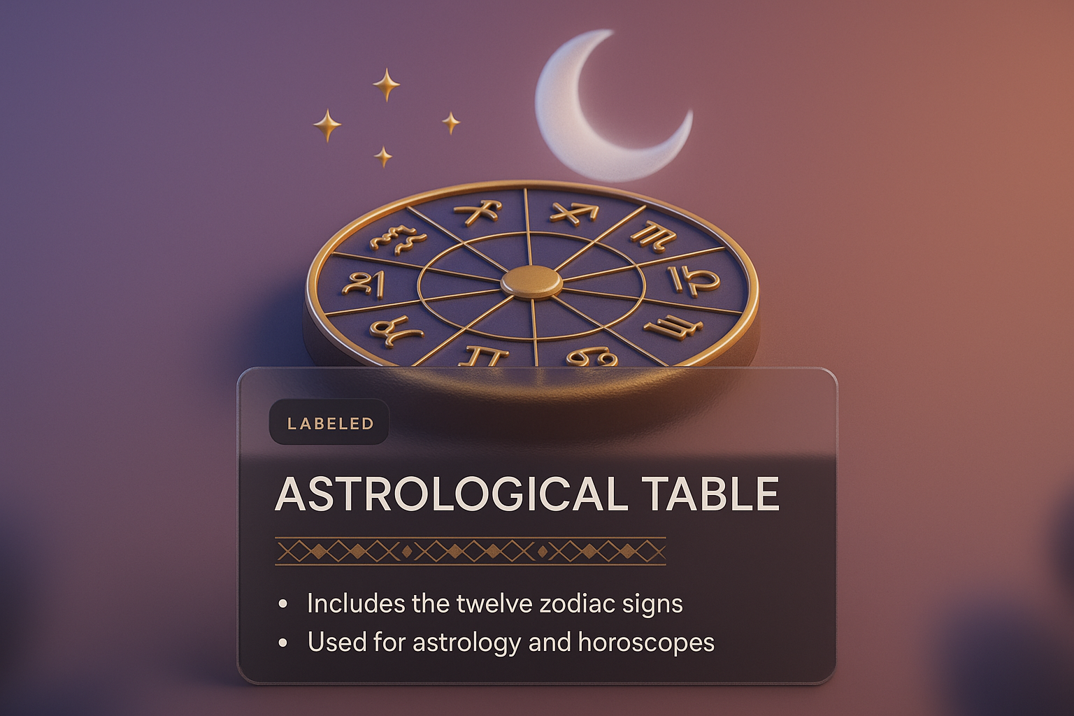 /Collection: /by davooda/Type: PNG/A detailed 3D illustration of an astrological table featuring zodiac signs, complemented by a dark overlay with labeled information. The design showcases a smooth gradient background and layered elements for depth.