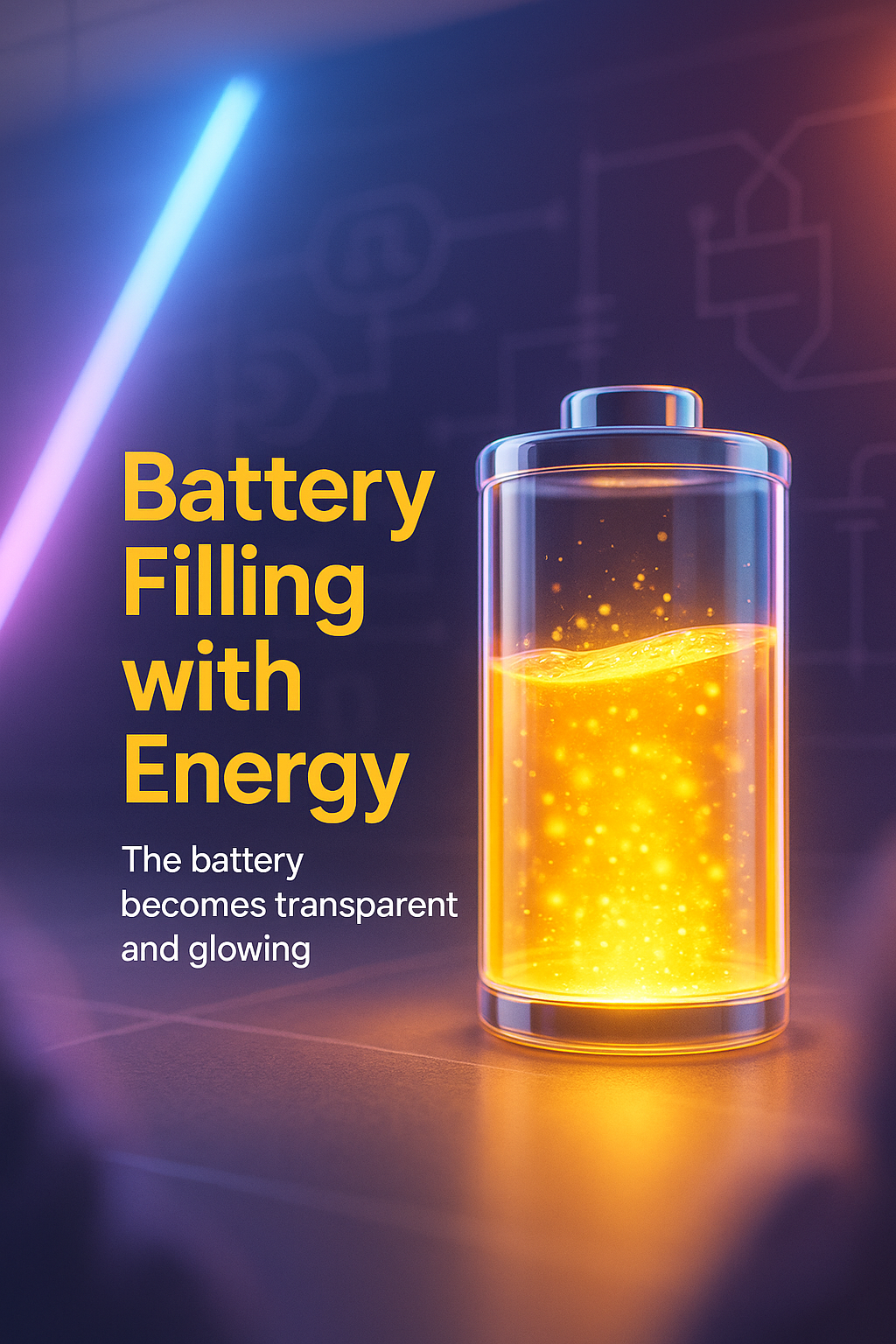 /Collection: /by davooda/Type: PNG/A visually striking illustration of a battery filling with energy, showcasing a glowing and transparent design. Ideal for tech-related content or energy topics.
