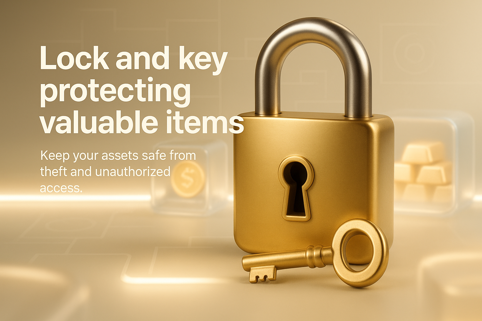/Collection: /by davooda/Type: PNG/A visually striking 3D illustration featuring a golden lock and key, symbolizing security and protection of valuable items. Ideal for financial services or security-related content.
