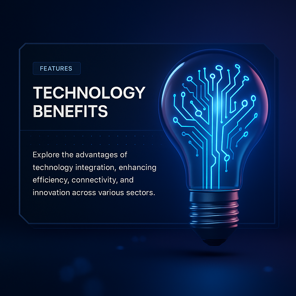 /Collection: /by davooda/Type: PNG/A 3D illustration of a glowing light bulb with circuit patterns, set against a dark gradient background. It features a sleek, modern design emphasizing technology benefits.