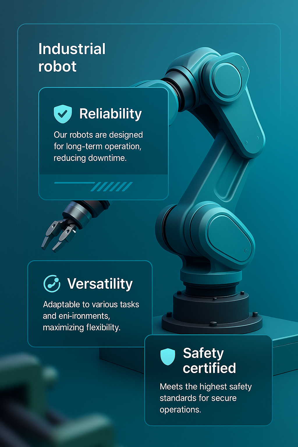 /Collection: /by davooda/Type: PNG/A detailed 3D illustration of an industrial robot, showcasing its features like reliability, versatility, and safety certification. The design includes integrated text blocks and visual elements.