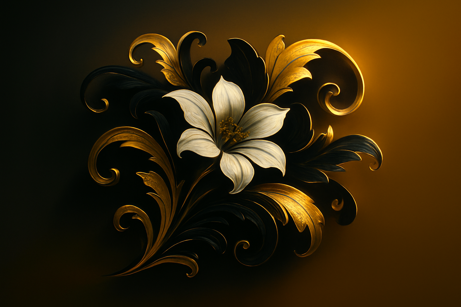 A sophisticated abstract floral design featuring a prominent white flower surrounded by elegant black and gold swirls, set against a smooth dark background.