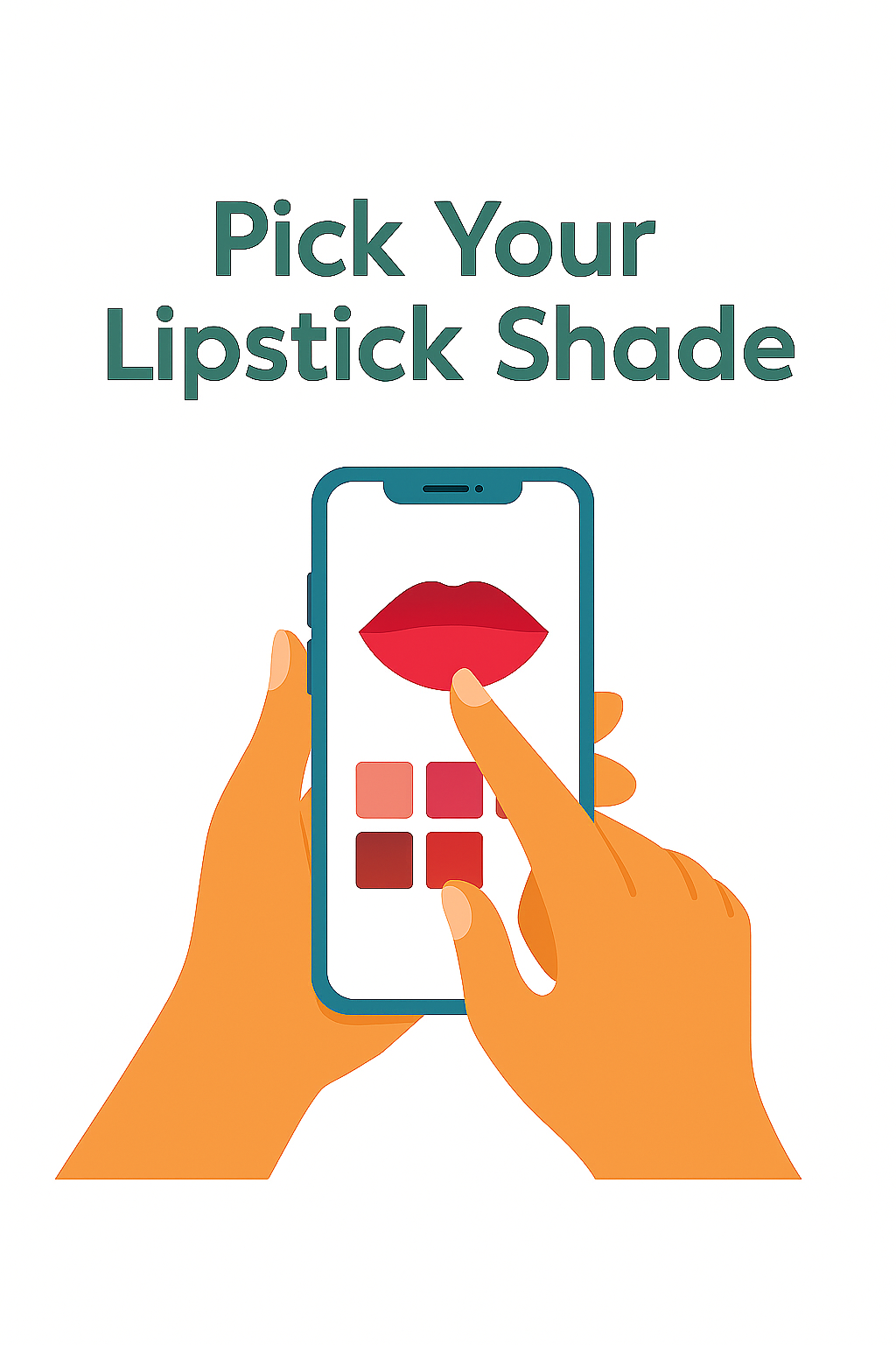 Illustrative graphic depicting a hand selecting a lipstick shade on a smartphone, ideal for beauty apps or cosmetics marketing. Modern and vibrant design elements draw attention.
