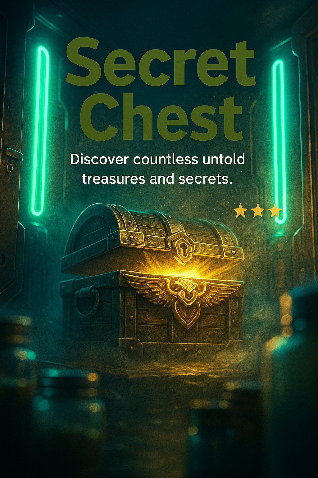 A captivating and dynamic design featuring a secret chest illuminated by neon lights. The composition includes layered elements, with a bold headline and engaging content, creating an inviting atmosphere.