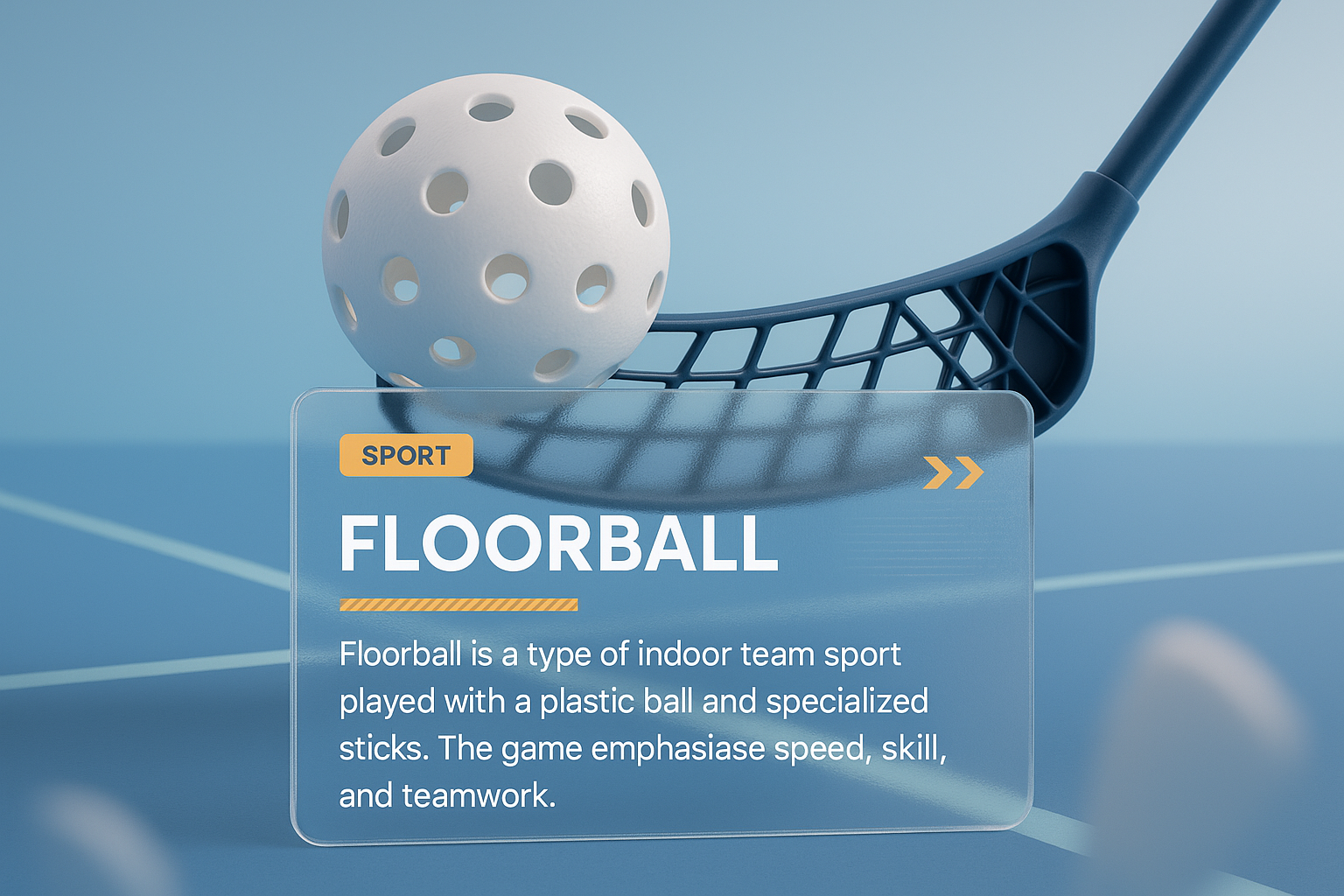 /Collection: /by davooda/Type: PNG/A visually appealing 3D illustration of floorball featuring a plastic ball and specialized stick. The design includes an integrated text block with information about the sport.