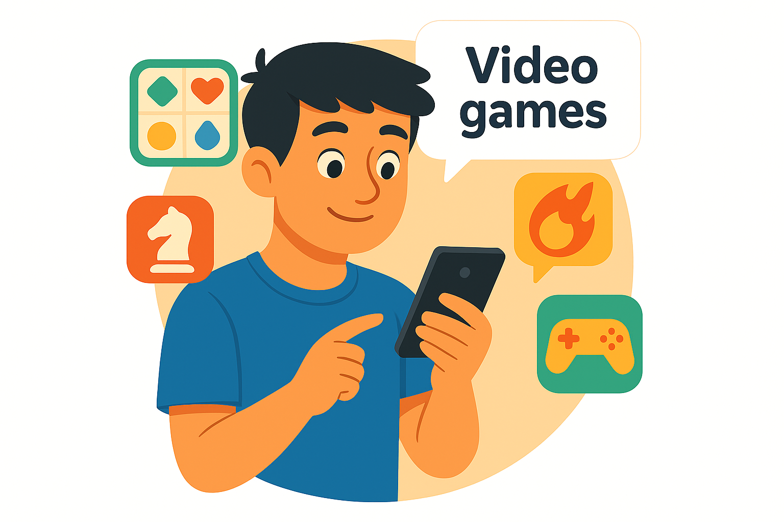 /Collection: /by davooda/Type: PNG/Colorful digital illustration depicting a young boy playing video games on his smartphone, surrounded by game-related icons. Ideal for gaming-related content and marketing.