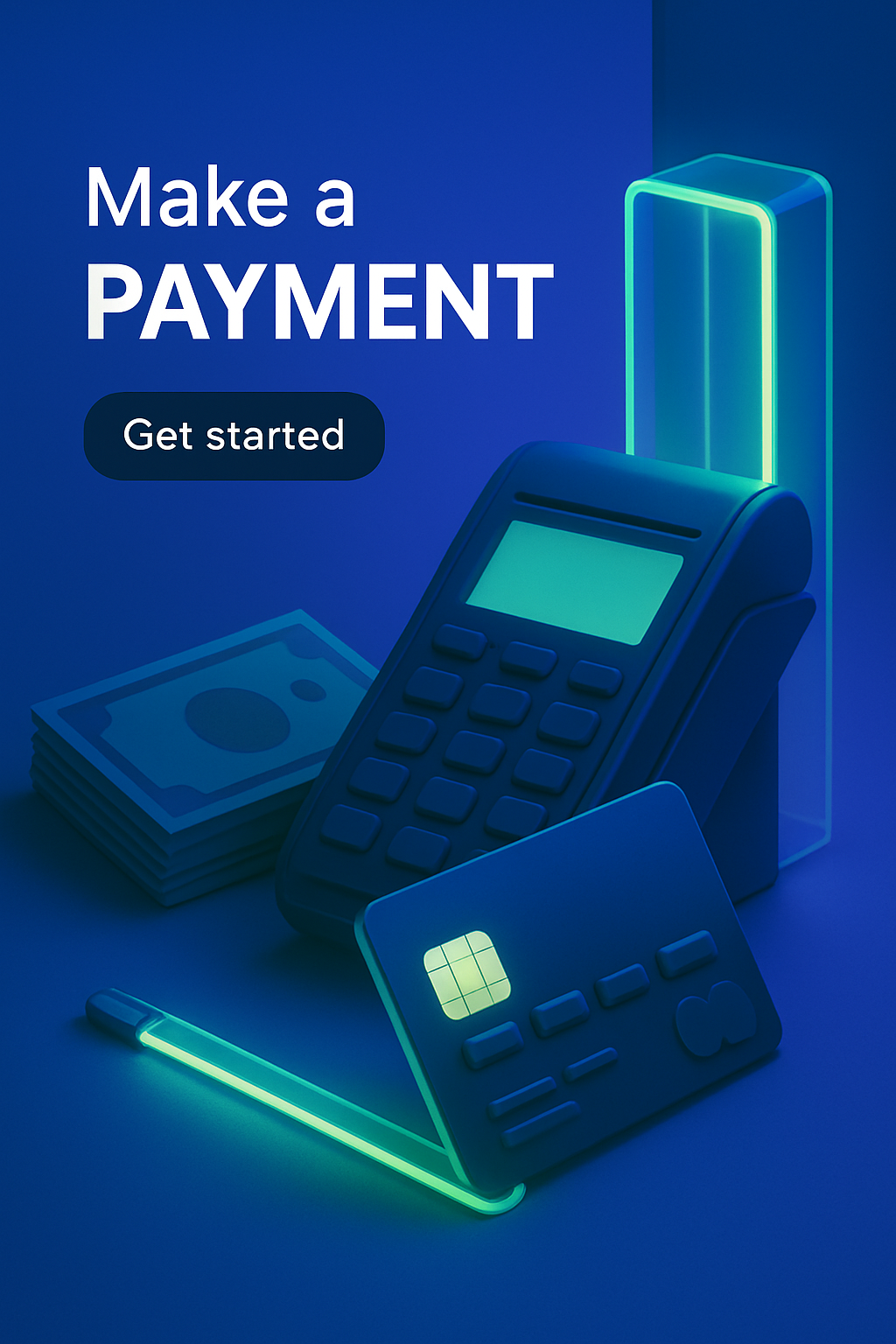 /Collection: /by davooda/Type: PNG/The image features a stylized payment setup with a phone, credit card, and cash, all illuminated by neon lines in a blue and green hue. The shadowy atmosphere enhances the glow of the objects.