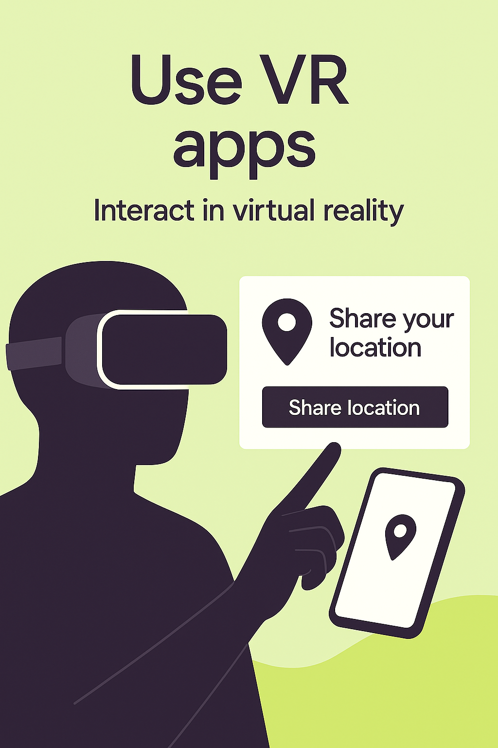 /Collection: , /by davooda/Type: PNG/Illustrative graphic promoting VR apps with a focus on location sharing. Features a modern design with silhouette and smartphone, ideal for tech-related marketing.