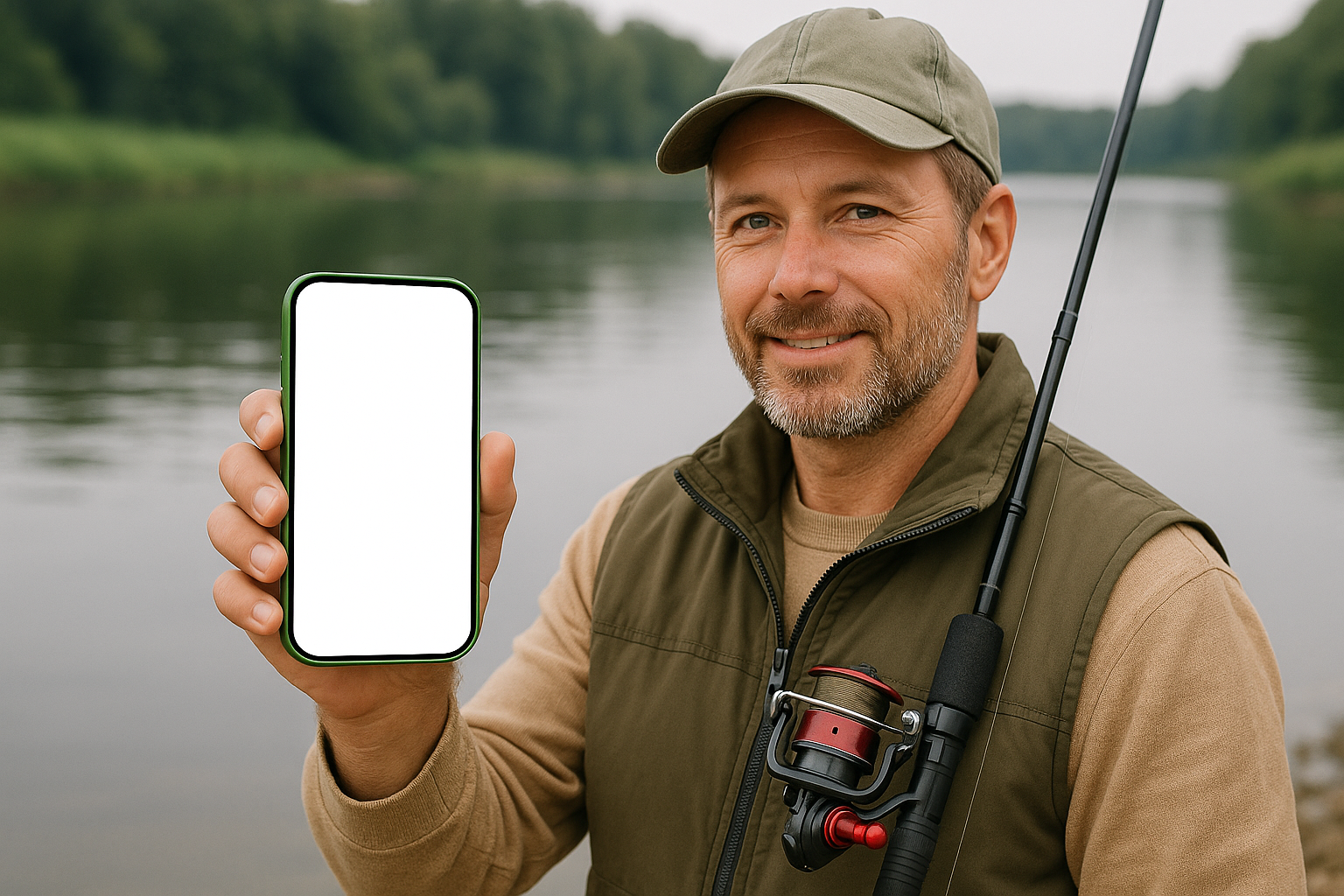 A man dressed in fishing gear smiles while holding a green smartphone with a blank screen. He stands near a serene water body, surrounded by lush greenery.