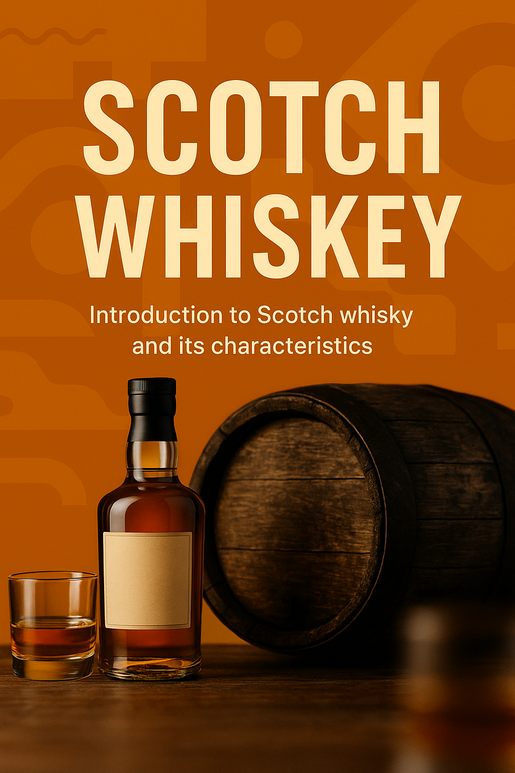 /Collection: /by davooda/Type: PNG/A visually appealing promotional graphic featuring a bottle of Scotch whiskey and a glass, set against a warm orange background. Ideal for educational content or marketing materials related to whiskey.