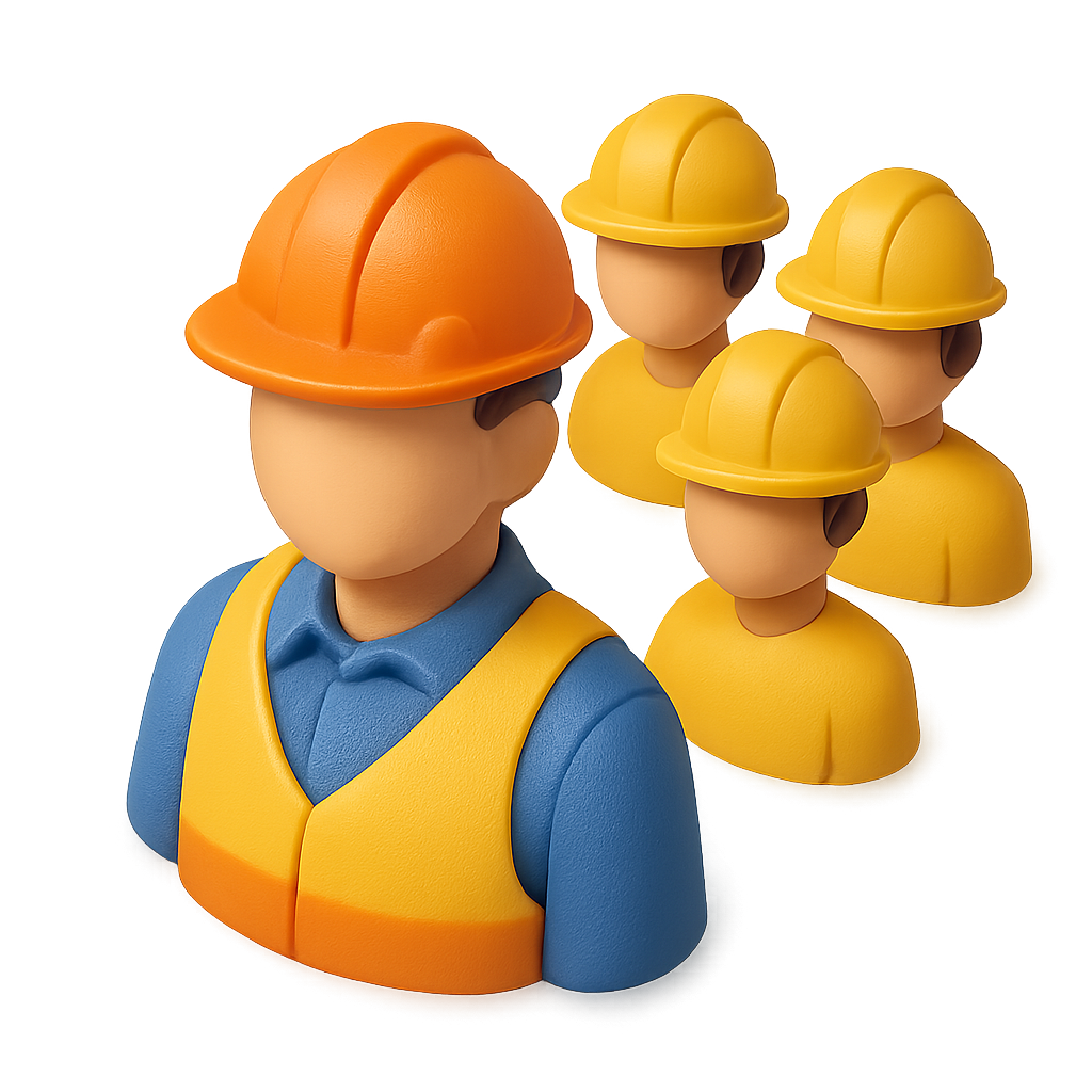 A vibrant 3D illustration featuring a foreman in a blue shirt and orange hard hat, accompanied by three crew members in yellow hard hats. The isometric design adds depth.