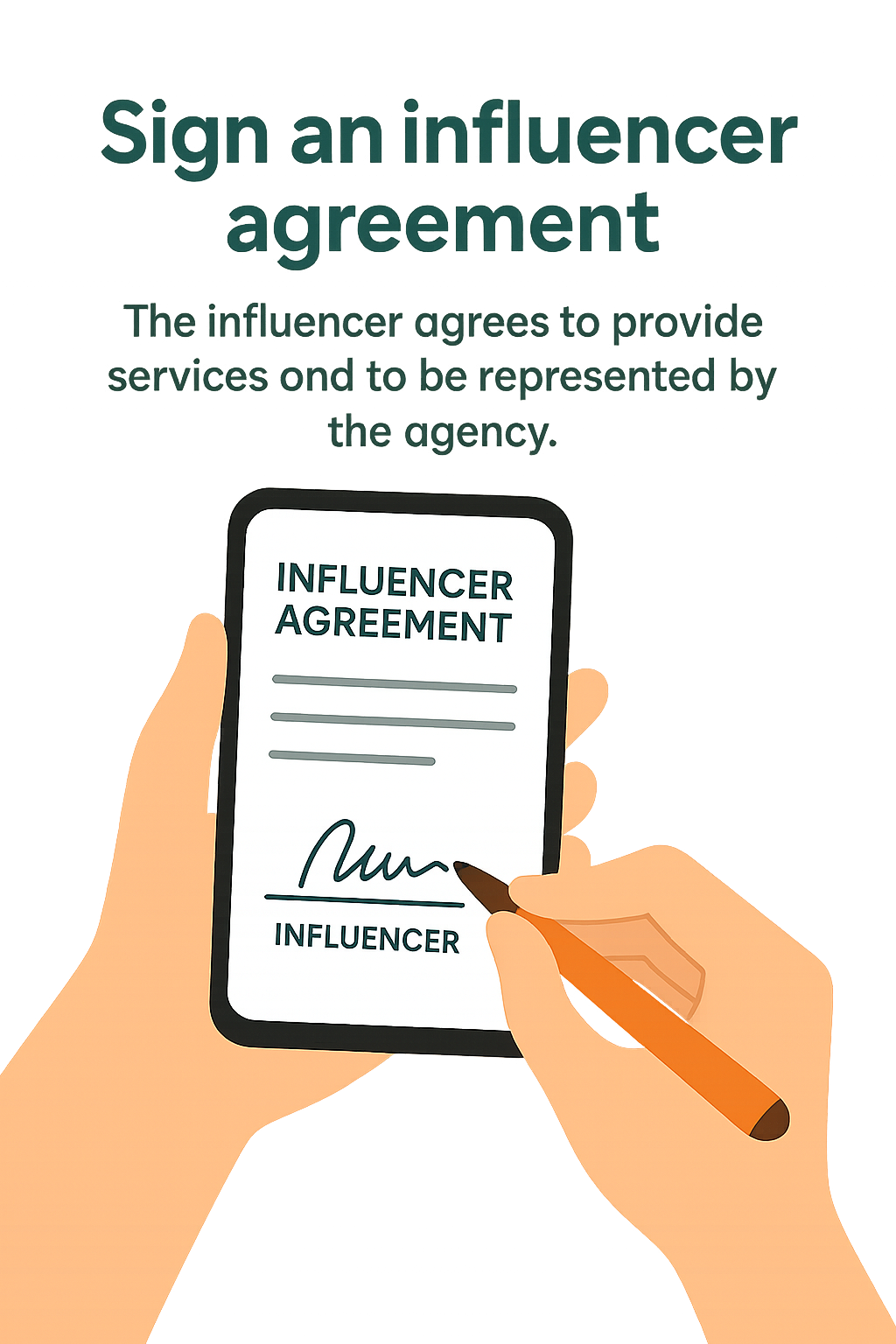 /Collection: /by davooda/Type: PNG/Illustrative graphic depicting a hand holding a digital influencer agreement on a smartphone, designed for use in marketing materials targeting influencers and agencies.