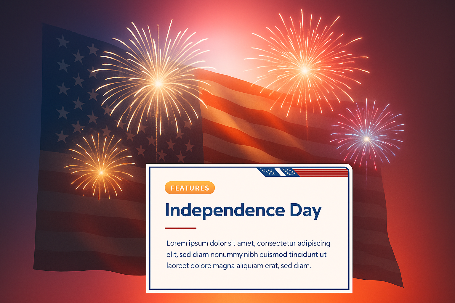 /Collection: /by davooda/Type: PNG/An artistic depiction of vibrant fireworks illuminating the background of an American flag, celebrating Independence Day. The composition features a bright gradient backdrop with a modern design.