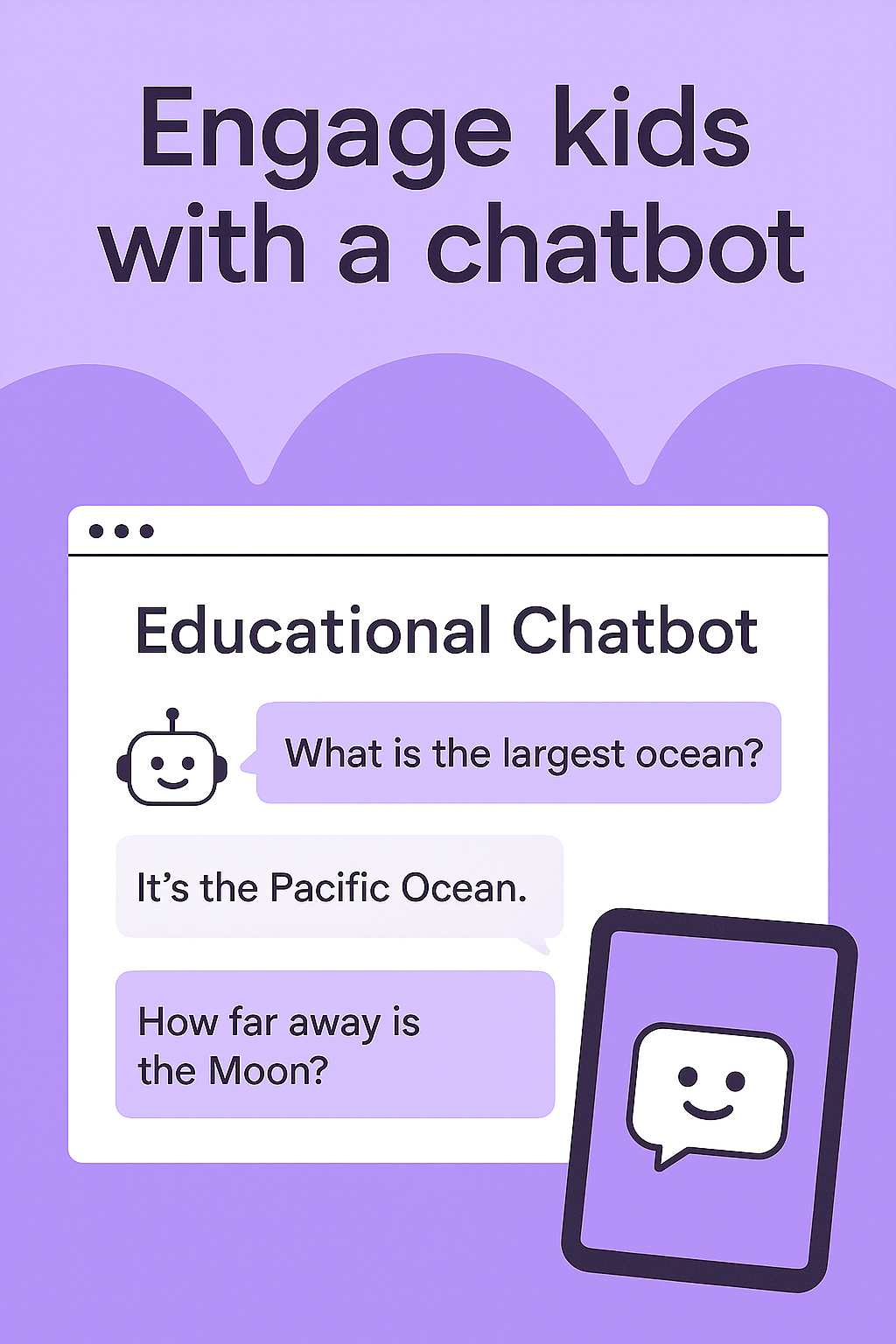 /Collection: /by davooda/Type: PNG/Vibrant graphic showcasing an educational chatbot interaction aimed at engaging children. The design features playful elements and a modern interface, suitable for educational apps or marketing materials.