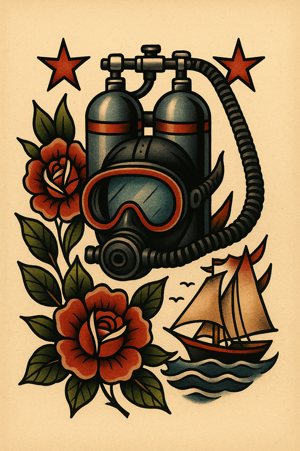 This image features a vintage scuba diving helmet surrounded by roses and a sailboat, illustrating a classic tattoo art style. Ideal for nautical or adventure themes.